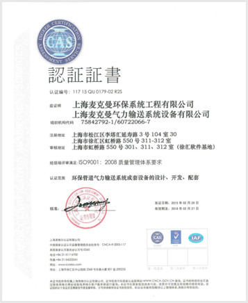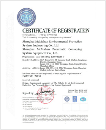 上海麥克曼氣力輸送設備有限公司系統成套設備認證證書 ······························································································································································································································